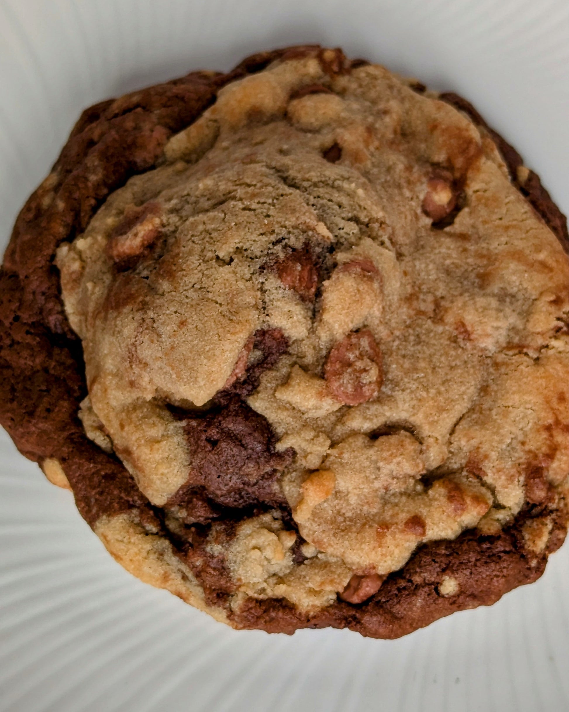 Picture a graham cracker topped with Hershey's milk chocolate and a jumbo marshmello, then wrap it with a mixture of chocolate chip cookie dough and brownie batter creating the perfect delicious stuffed Brookie!